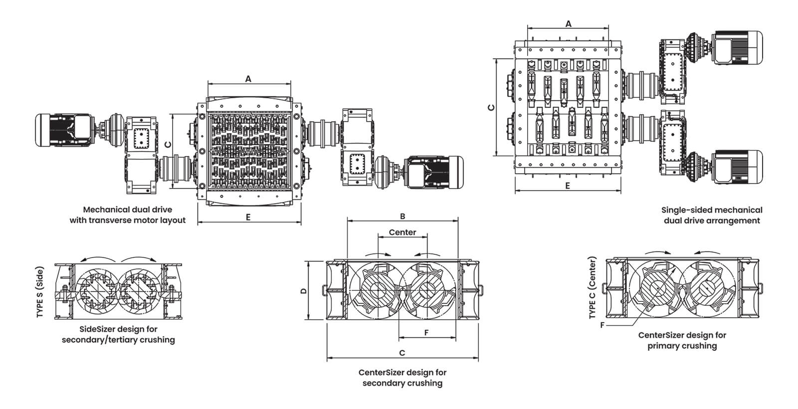 Merkez Sizer, besleme malzemesini kırma odasının ortasında bulunan kırıcı dişler arasında kırarken, Yan Sizer besleme malzemesini kırıcı dişler ile uzunlamasına taraflara yerleştirilmiş ayarlanabilir kırıcı taraklar arasında kırar.